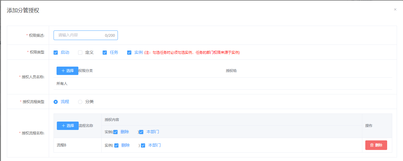 删除为赋予授权用户在实例管理中进行删除的权限;本部门的为在实例管理中只查看当前人所在组织的流程实例
