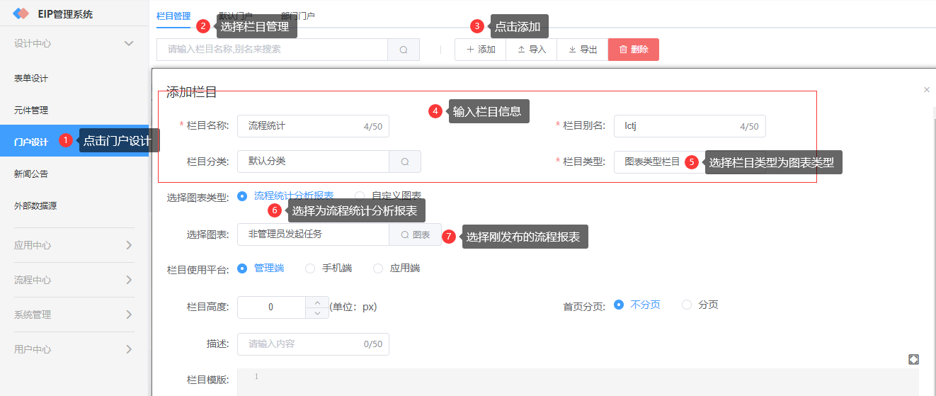 第三步:将该流程报表添加为栏目并把该栏目配置到管理端的首页上