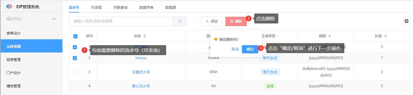 注:删除流水号时请确认该对话框没有在表单中绑定使用,否则在表单中会中提示该流水号不存在;