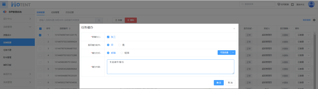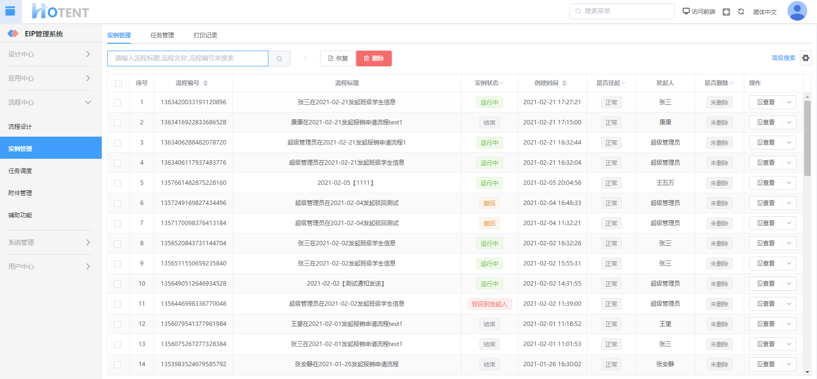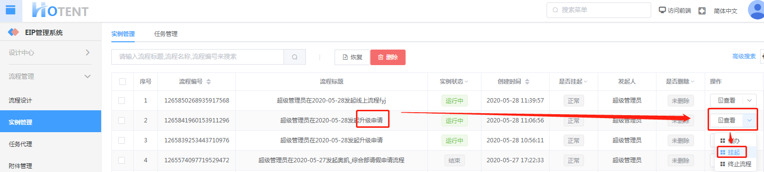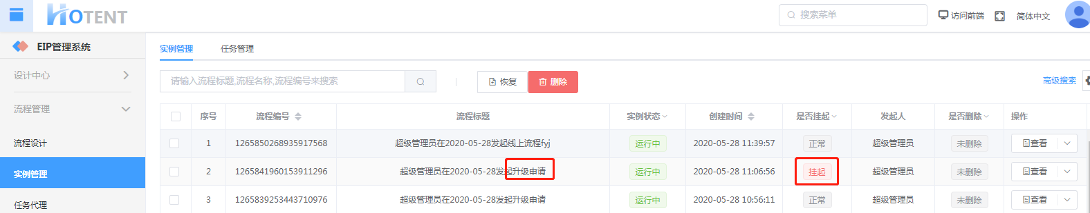 实例管理是查看流程实例信息及对流程实例进行挂起或取消挂起,删除,恢复删除等操作,对流程表单,审批历史进行干预,表单修改历史记录查询;