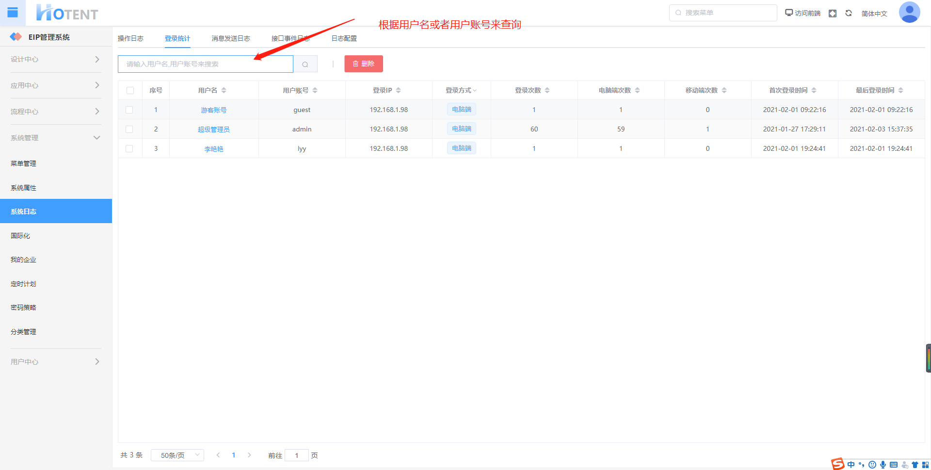 第二步:可通过输入框输入关键字搜索或用户账号等进行筛选查找相关的登录日志