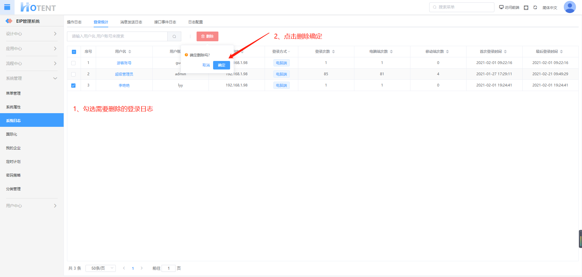 操作:【系统属性】→【系统日志】→【登录统计】→勾选需删除的日志→点击“删除。