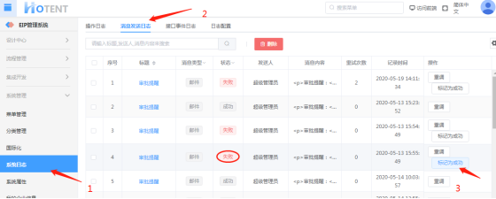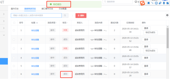 消息发送日志,有两状态:成功、失败。可通过“重调”以及“标记为成功“修改其状态。