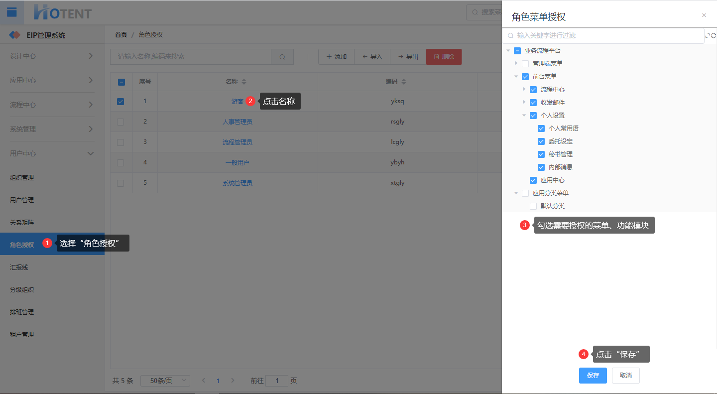 操作:【用户中心】→【角色授权】→点击名称→勾选需要授权的菜单、功能模块→单击“保存”