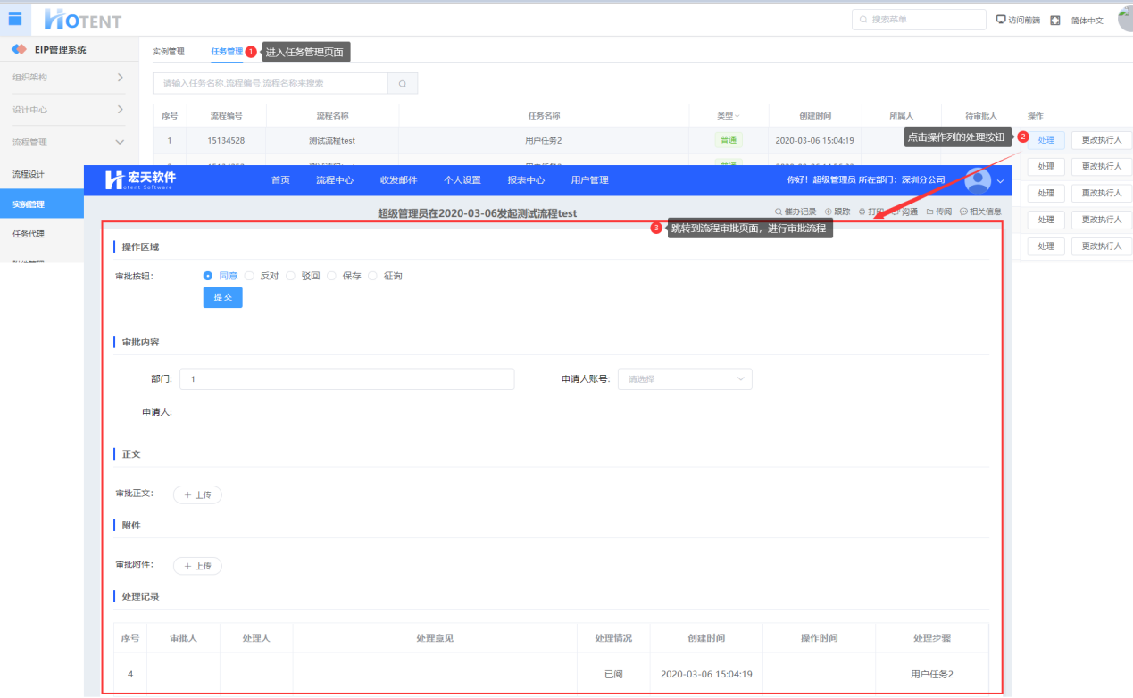 当流程流转到某个环节时,还是没有用户进行审批或是其他的情况,管理员可在【任务管理】页面中点击任何任务操作列的“处理”按钮,可以进入该任务的“任务办理”页面,代替该任务的待办人员进行处理,如下所示: