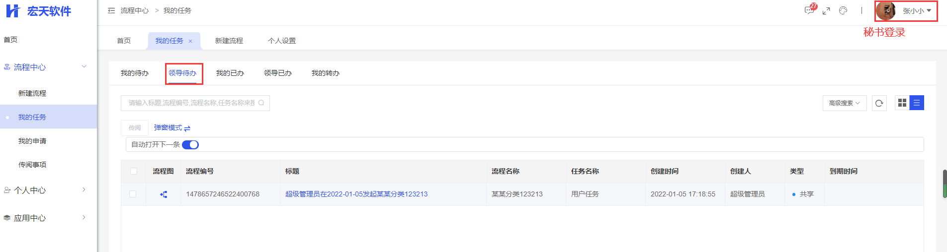 秘书代替领导审批流程时,需要在领导待办列表进行处理: