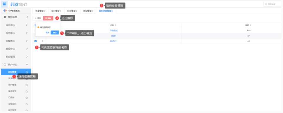 操作:【用户中心】→【组织管理】→【组织参数管理】→勾选参数名称→点击“删除”→单击“确定”