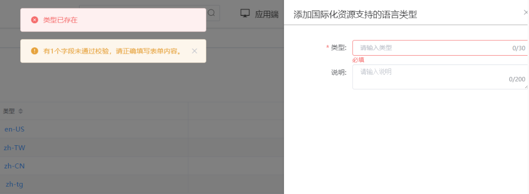 注:不能添加重复的语种类型,若添加重复,则报下面错误: