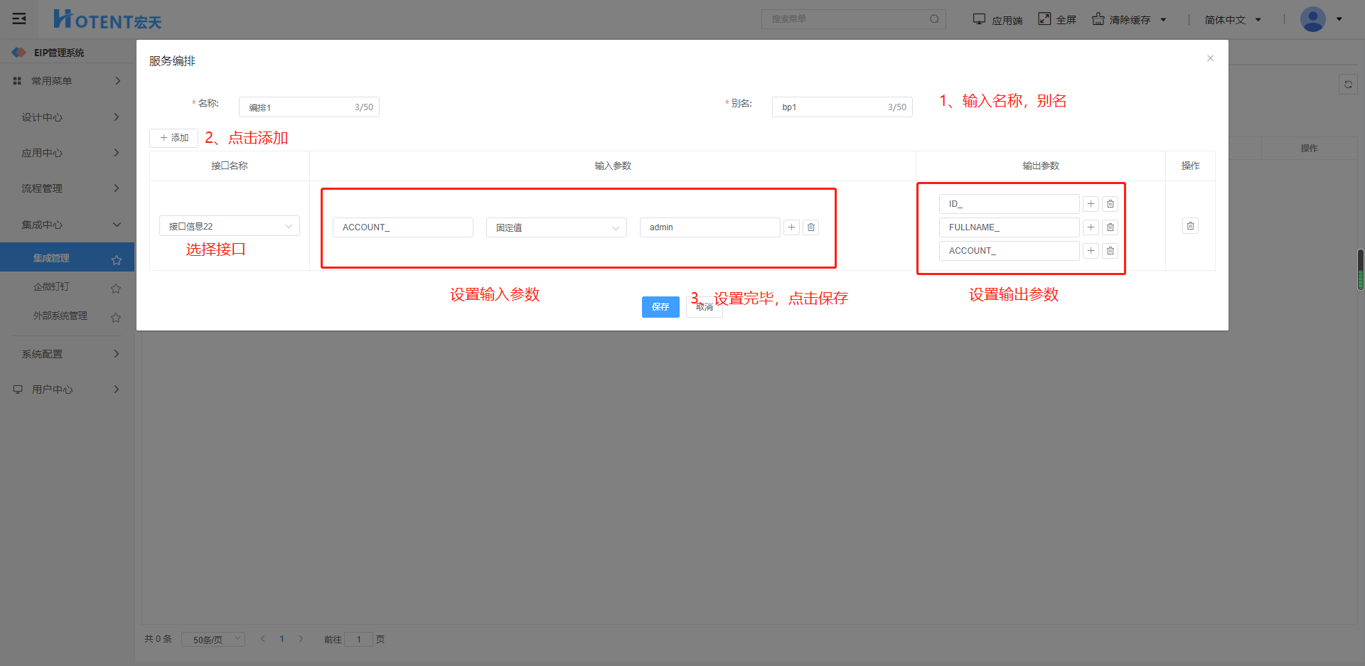 第一步:【集成中心】→【集成管理】→【服务编排】,单击“添加”,设置服务编排信息;