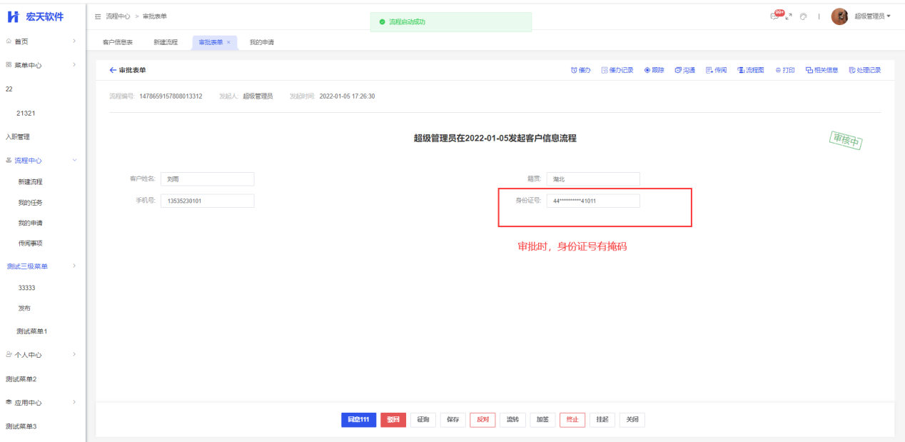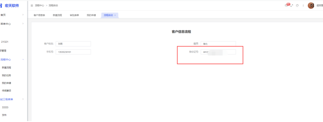 注:在流程中,不在数据脱敏中的白名单的用户,对“客户联系方式”这个字段进行修改是不生效的