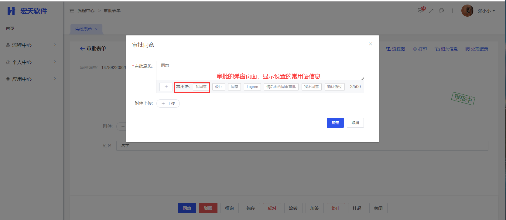 在审批流程时,即可在审批意见框下方点击常用语
