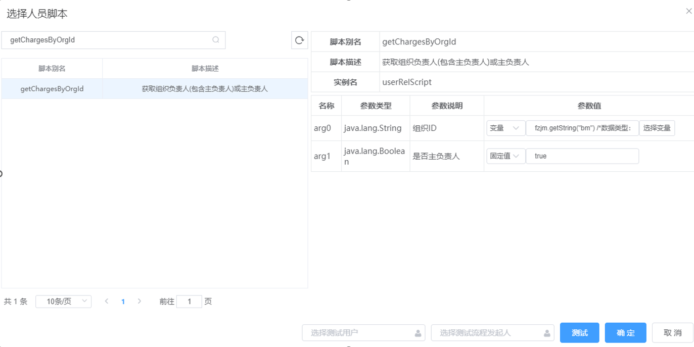 这个脚本可以找到指定组织以及这个组织下所有子组织中,拥有某个角色的人员,并取这个人员作为审批人。