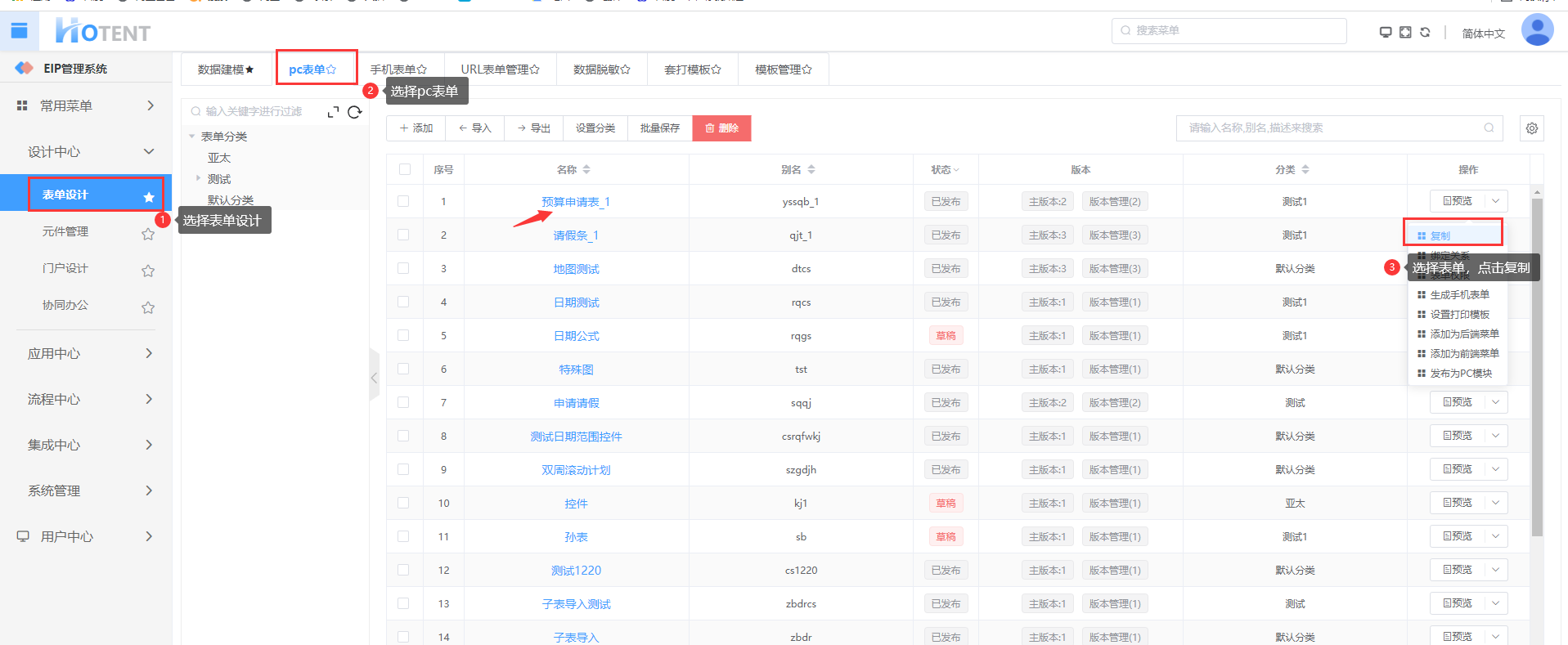 →【表单设计】→【PC表单】,点击要复制的表单的操作列下的“复制”,