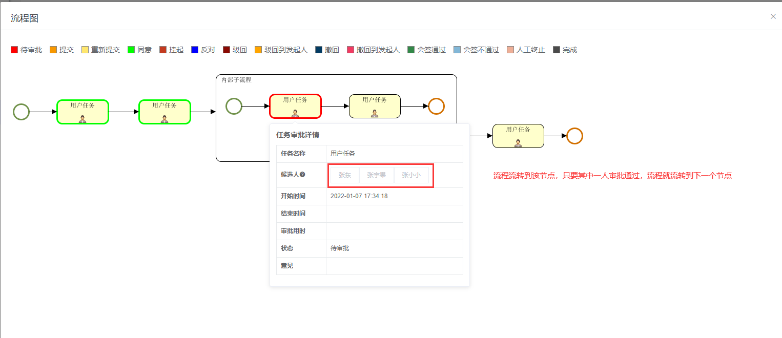 启动流程,流程运行到内部子流程第一个节点时,可以看到内部子流程只有一条任务,子流程第一个节点任务的待执行人有三个,这三个人员的【我的待办】中都有这该条任务的待办,他们对这个任务的审批是抢占式的,即其中一个审批后,其他两个人员的【我的待办】中不再有该条任务。