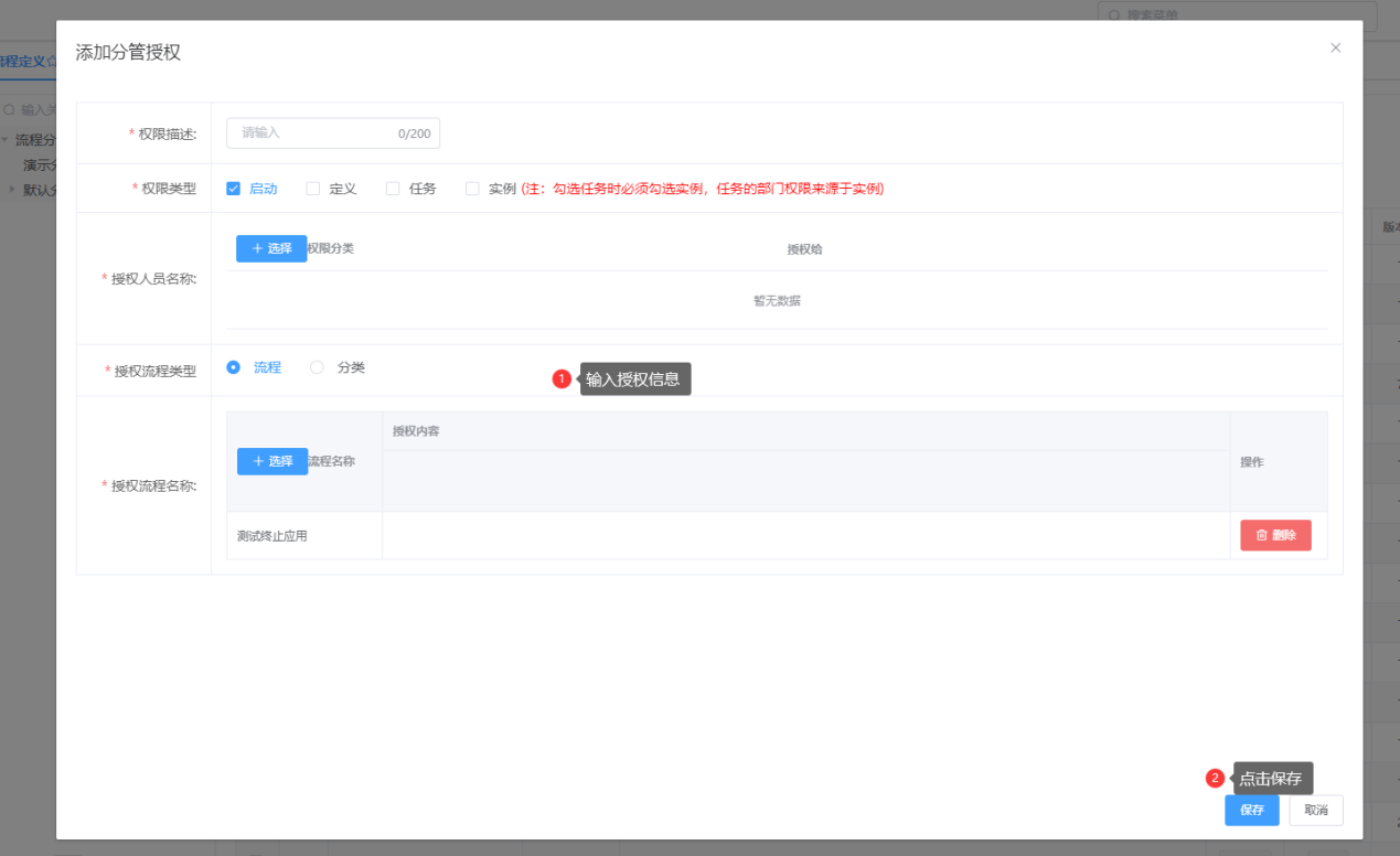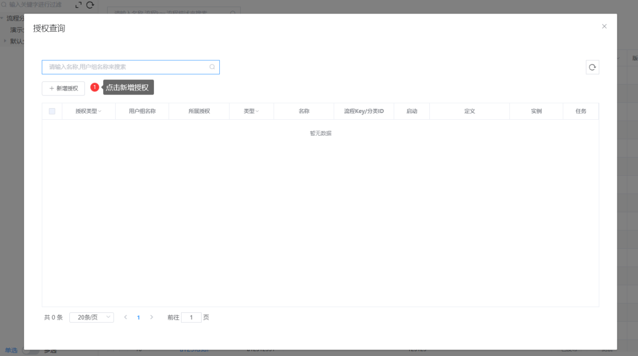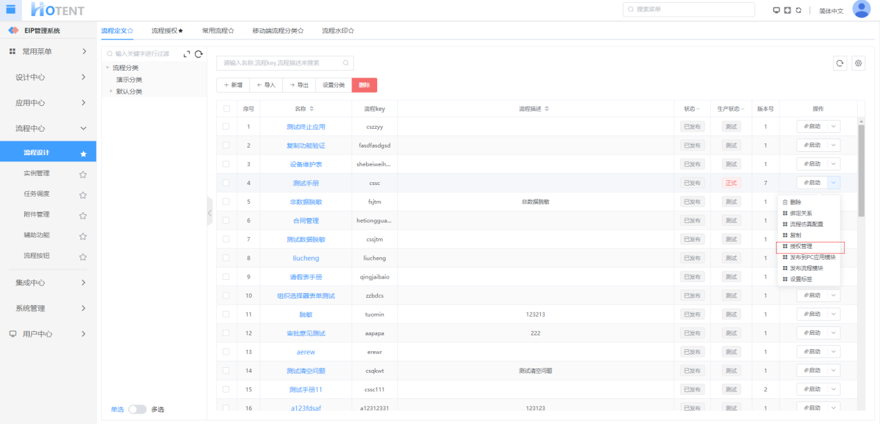 在每条流程后可以通过点击授权管理,快速进行授权配置,具体配置操作请参考流程授权配置模块功能