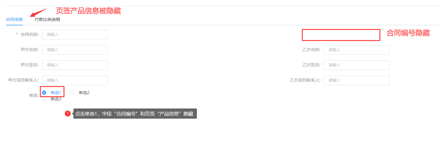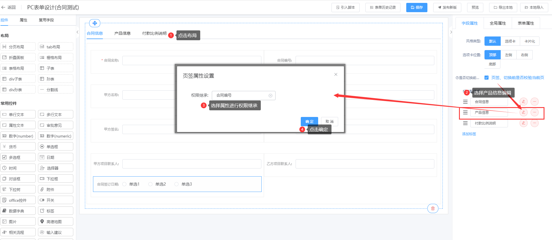 如:合同信息页签继承字段“合同编号”的显示隐藏权限