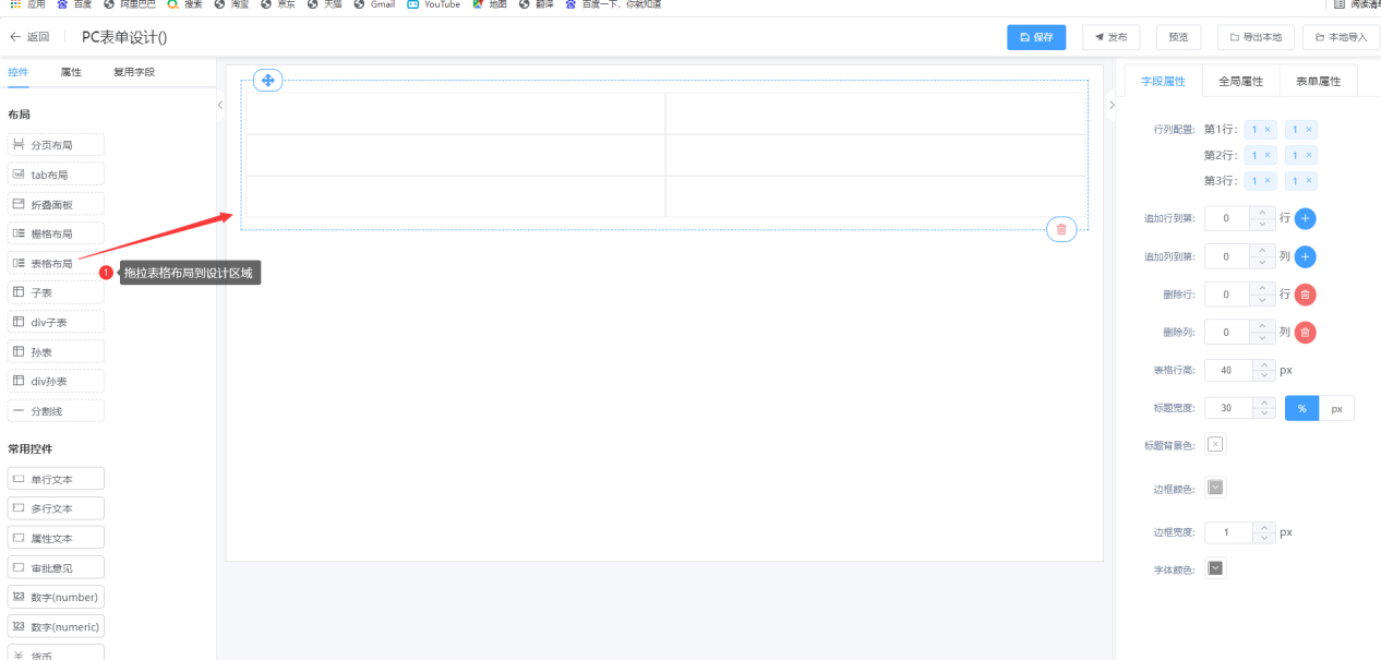 ② 在表单设计页面直接拖拉“表格布局”控件到设计其区域;