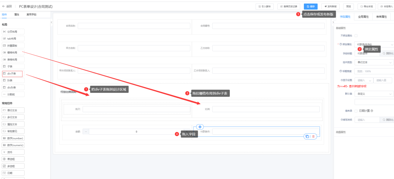 第一步:进入表单设计器页面,将div子表拖拉到表单设计区域;