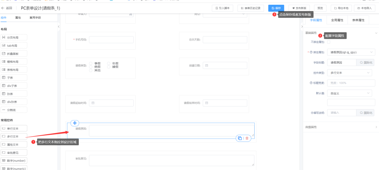 第一步:进入表单设计器页面,将多行文本拖拉到对应的栅格布局中;