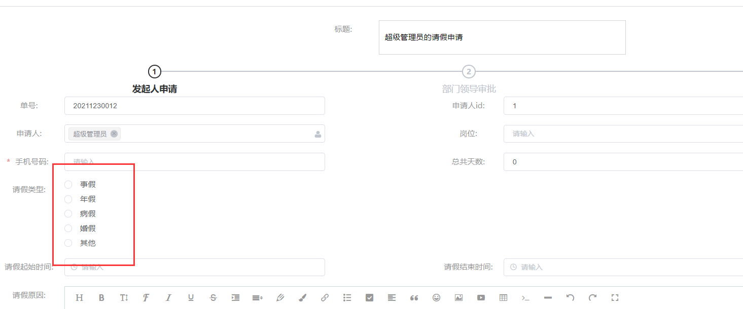 场景1:请假申请单中请假类型选择其他时,“请假事由”为必填,选择“年假或婚假”时,“请假事由”隐藏