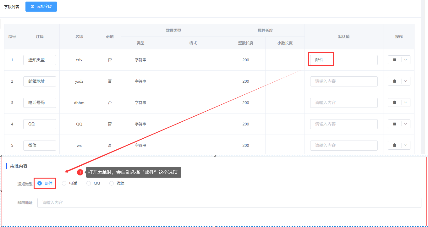小贴士:可在建模中给通知类型设置默认值,在打开表单时便可默认选择其中一只值;