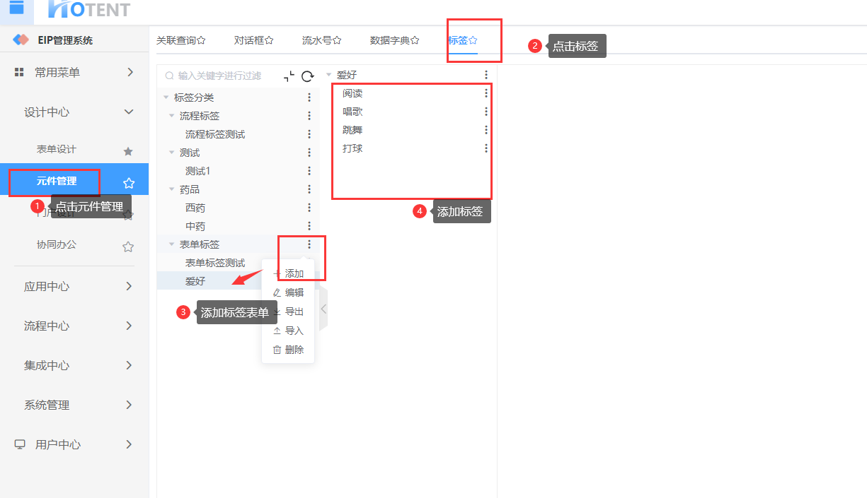 第一步:进入【元件管理】->【标签】中添加爱好标签