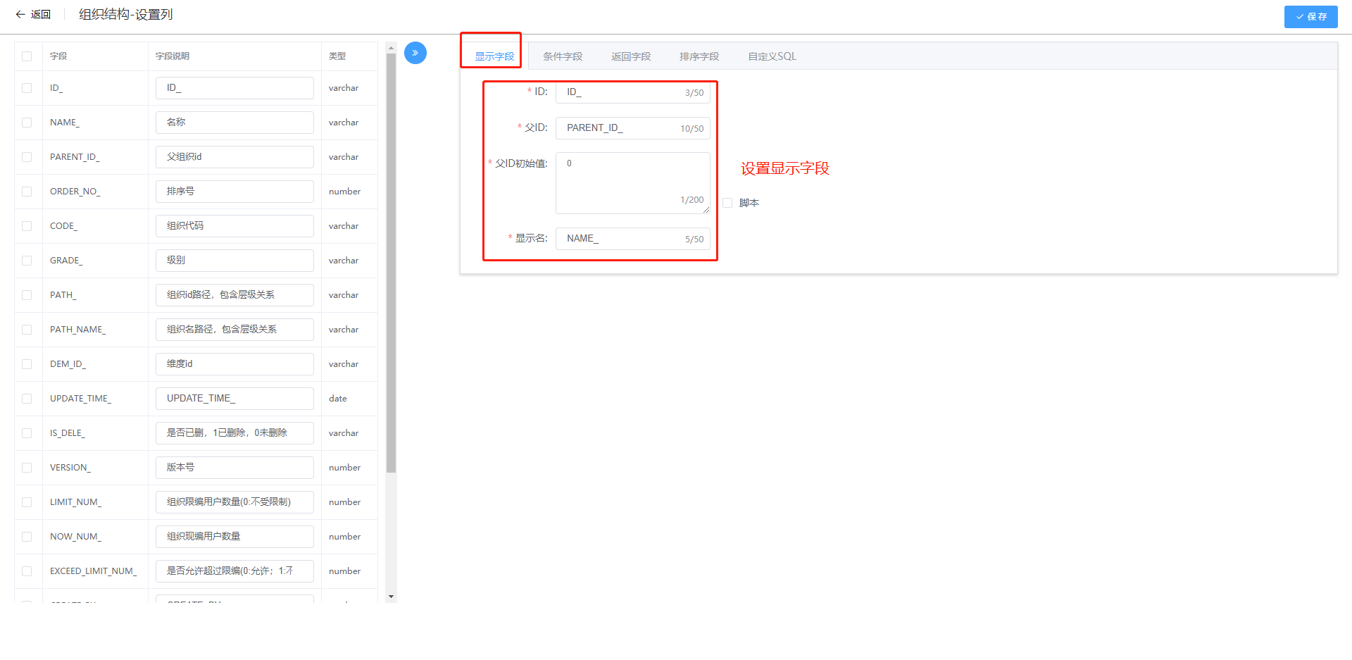 设置显示字段、条件字段等,设计完毕后点击右上角保存。