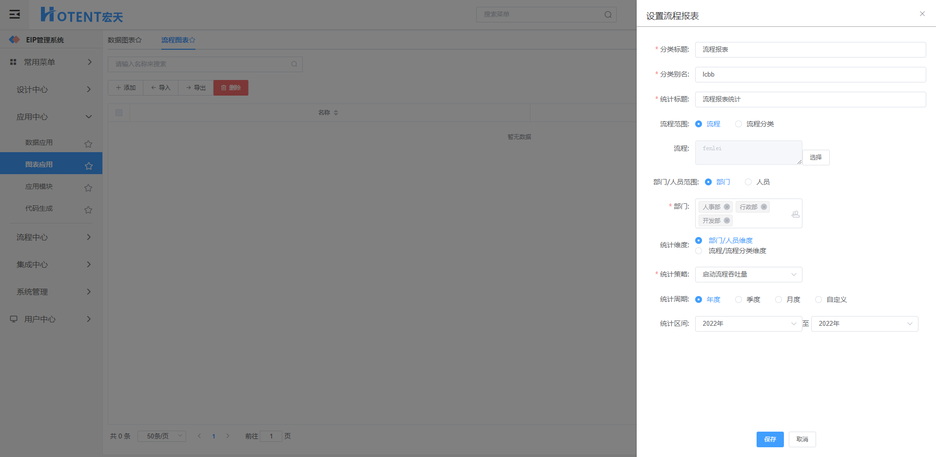 使用场景:配置一个流程报表用来统计三个部门发起流程,处理流程的任务吞吐量,并将这个图表展示到管理端首页上