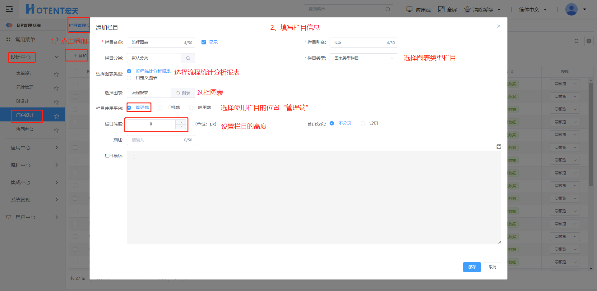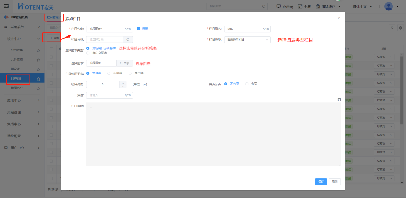 第三步:将该流程报表添加为栏目并把该栏目配置到管理端的首页上