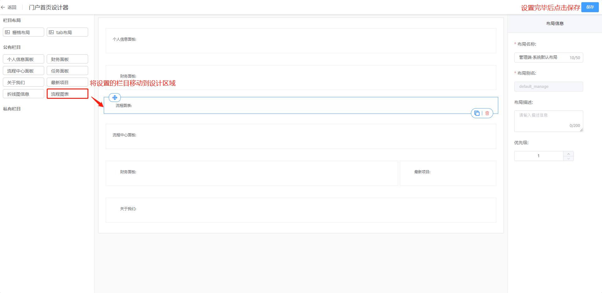 第七步:栏目添加成功后,可将该栏目添加到布局中,操作请参考【门户管理】;