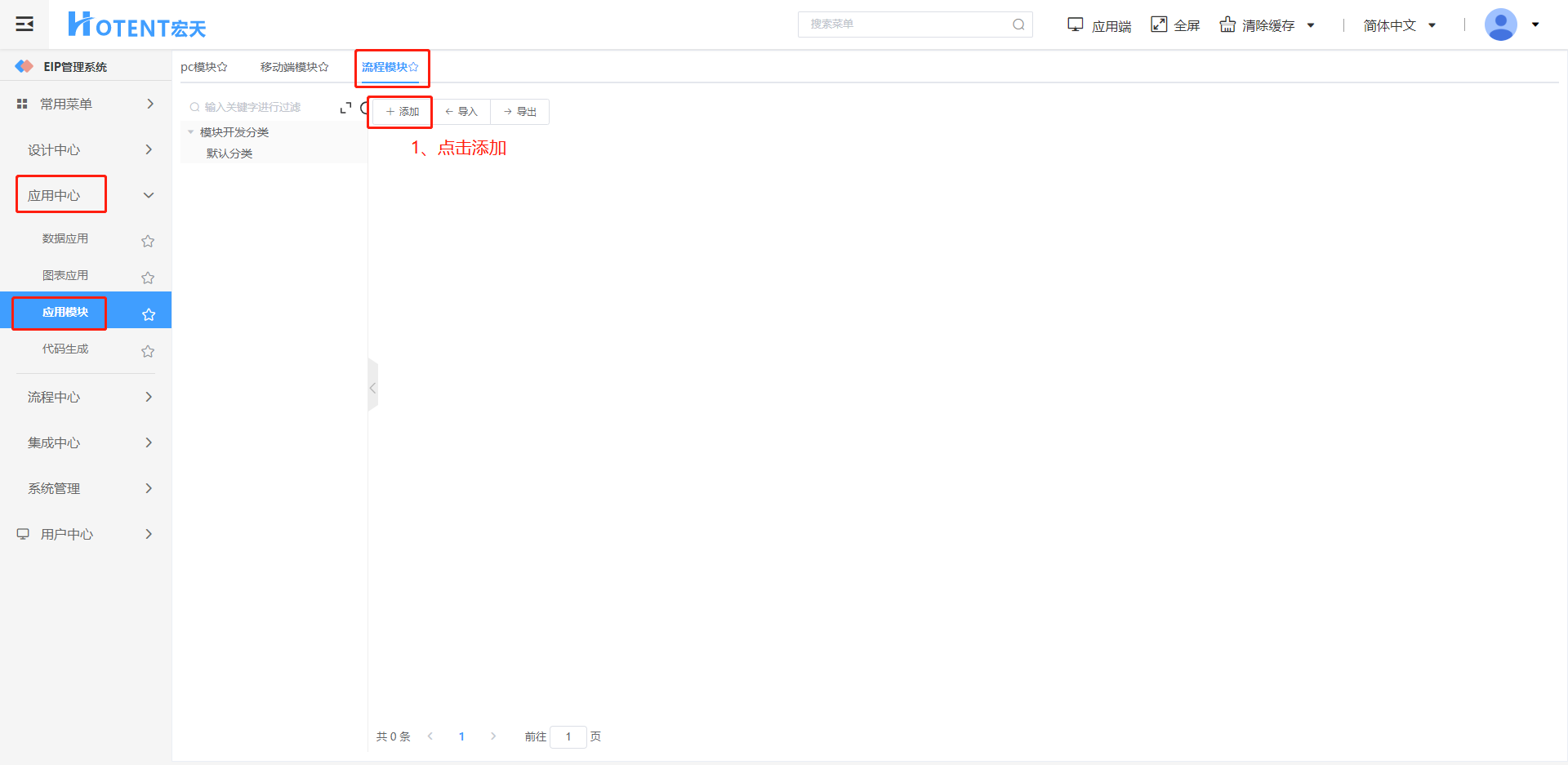 第一步:进入【应用中心】→【应用模块】→【流程模块】,点击添加,新增一个流程模块