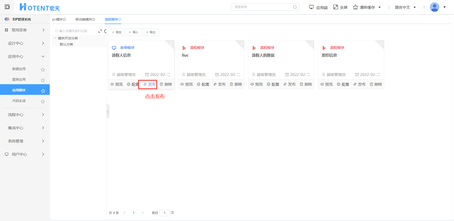 第二步:选择模块,点击{发布}按钮;