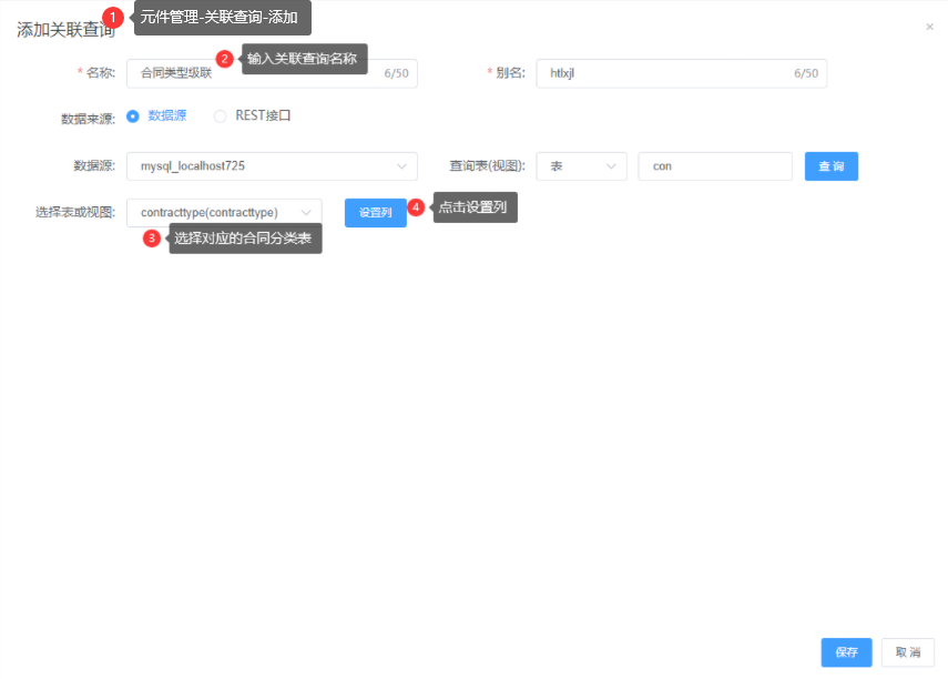 第一步:进入【元件管理】->【关联查询】中,配置级联的关联查询