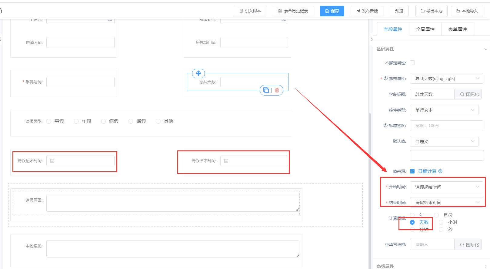 · 日期计算:将两个日期相减的值回填到该字段中;