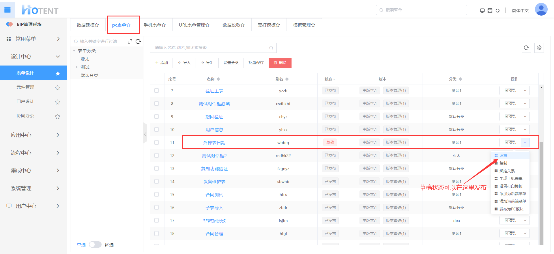 新增并生成表单后,业务表单的状态是“草稿”,状态是“草稿”的业务表单不能绑定到流程,只有状态是“已发布”的业务表单才能绑定到流程,如下所示: