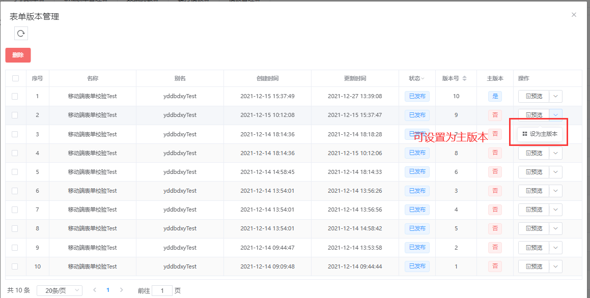 在【PC表单】列表中点击“版本”列的“版本管理”进入表单版本管理页面,在页面中显示表单的所有版本