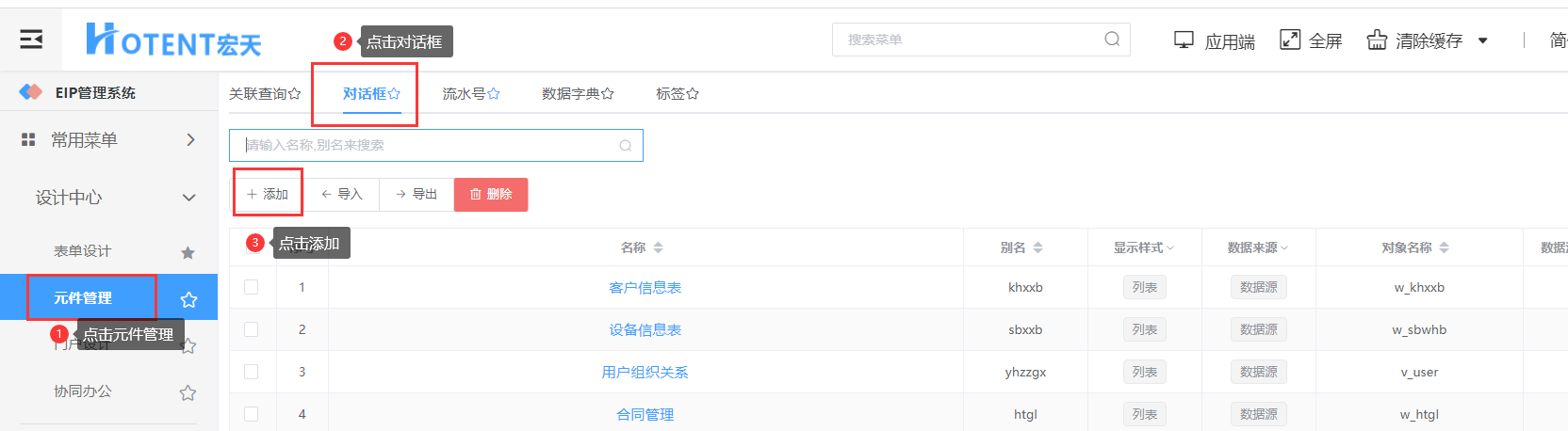第一步:【设计中心】→【元件管理】→【对话框】,点击“添加”;