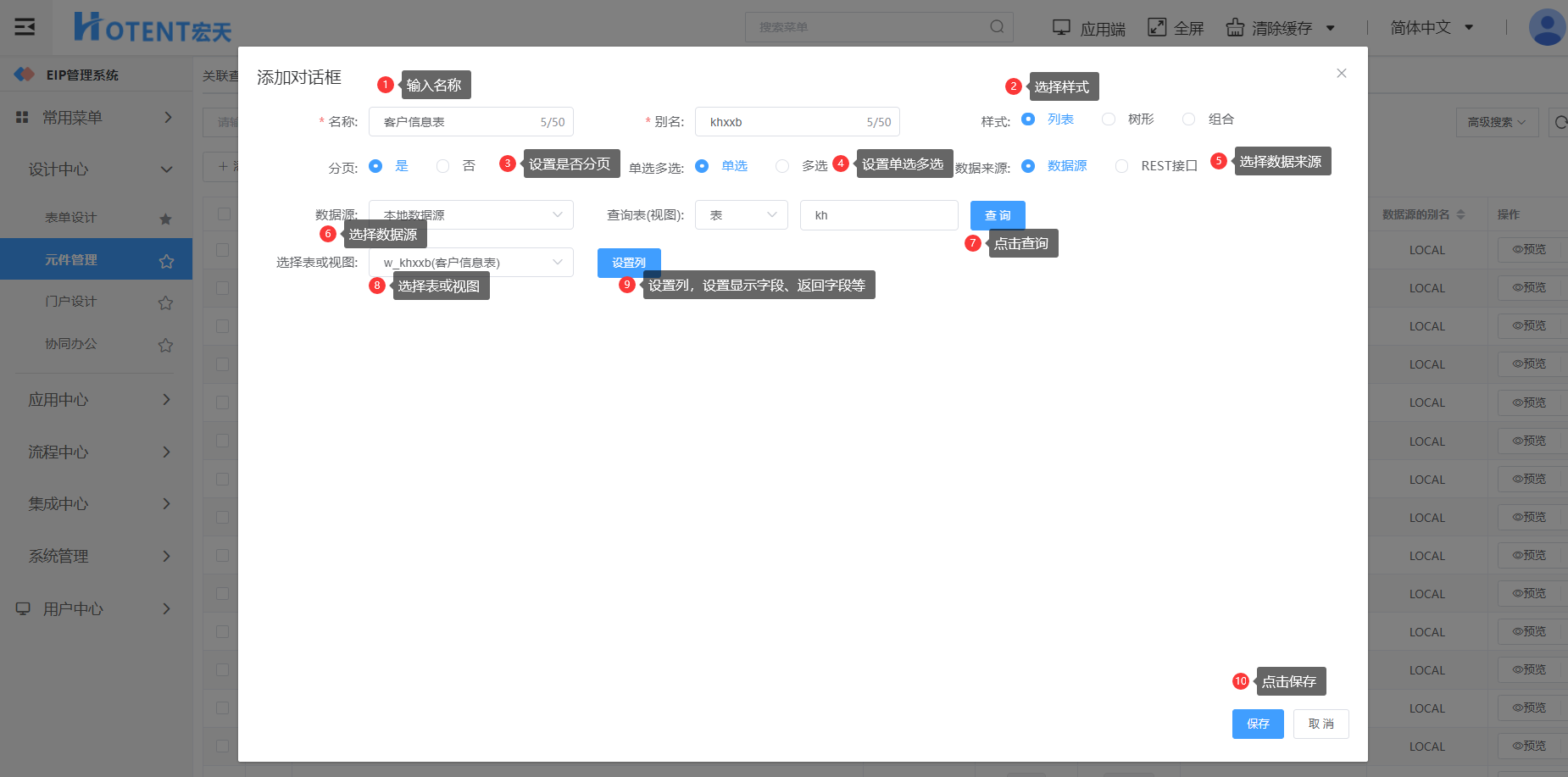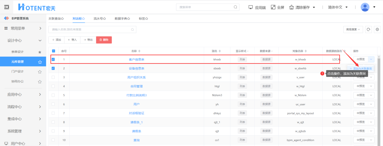 第一步:【设计中心】→【元件管理】→【对话框】,点击列表操作列的“添加为关联查询”;