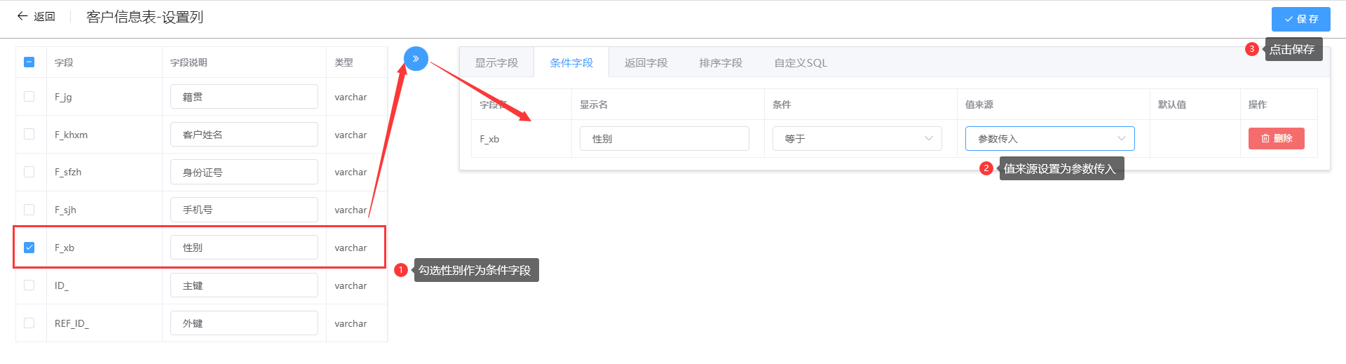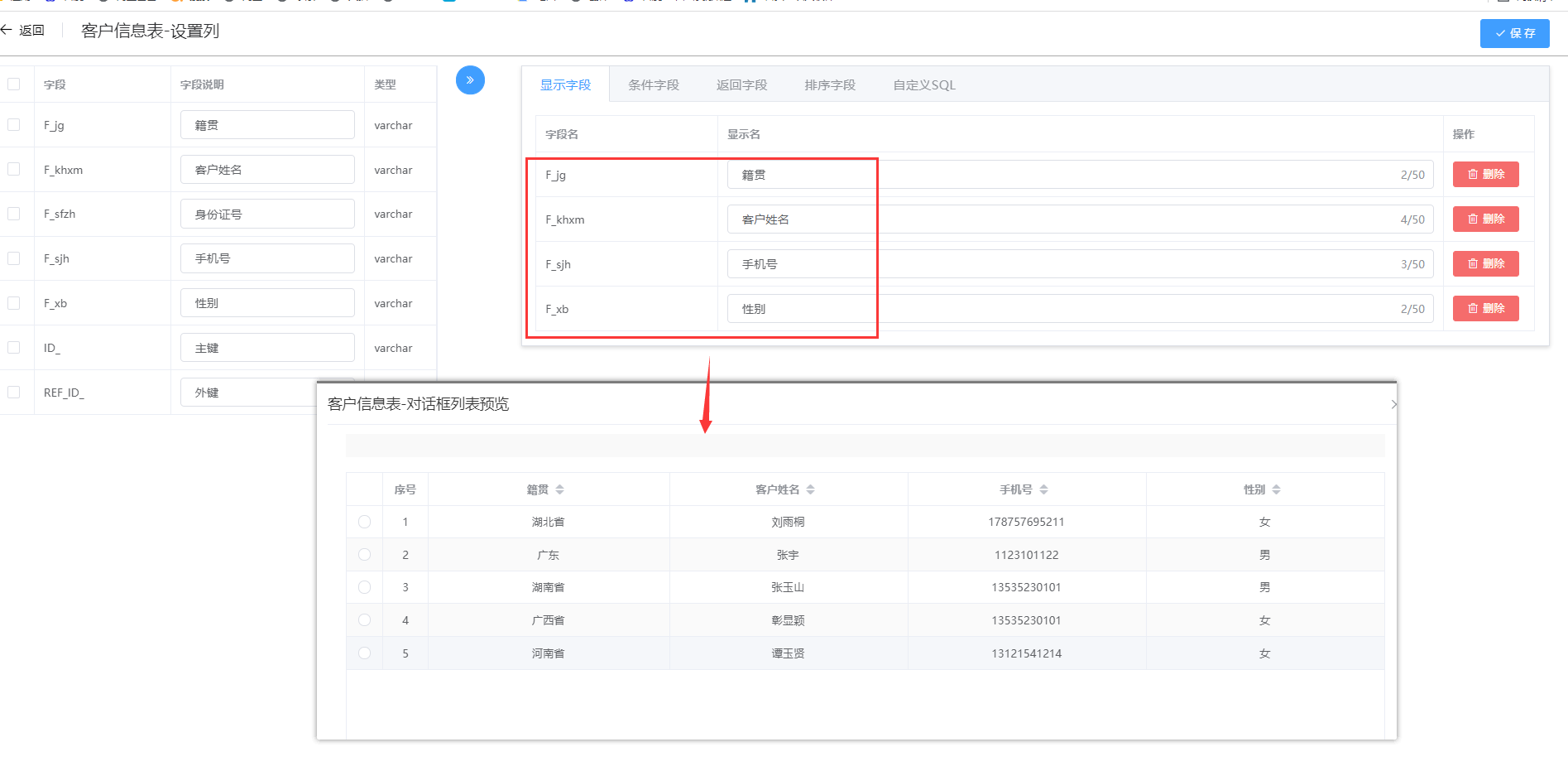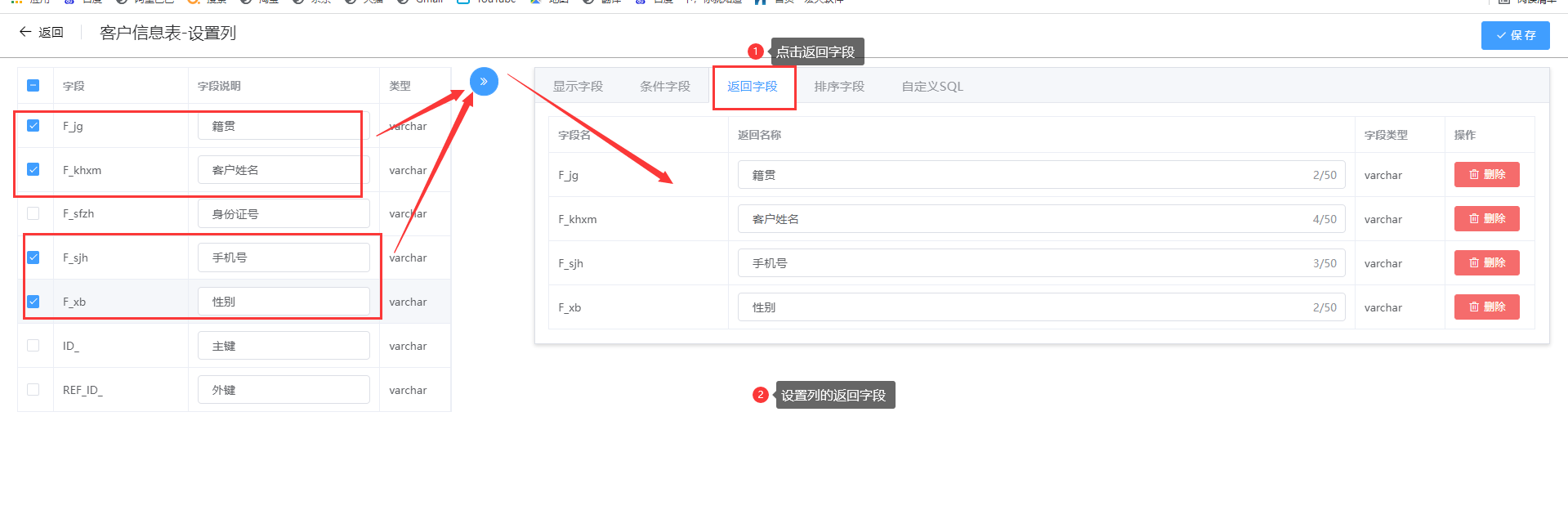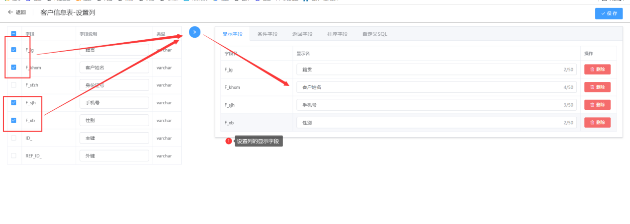 第三步:点击设置列-进入设置列页面,设置对话框的显示字段及条件字段等,设置完毕后点击保存;