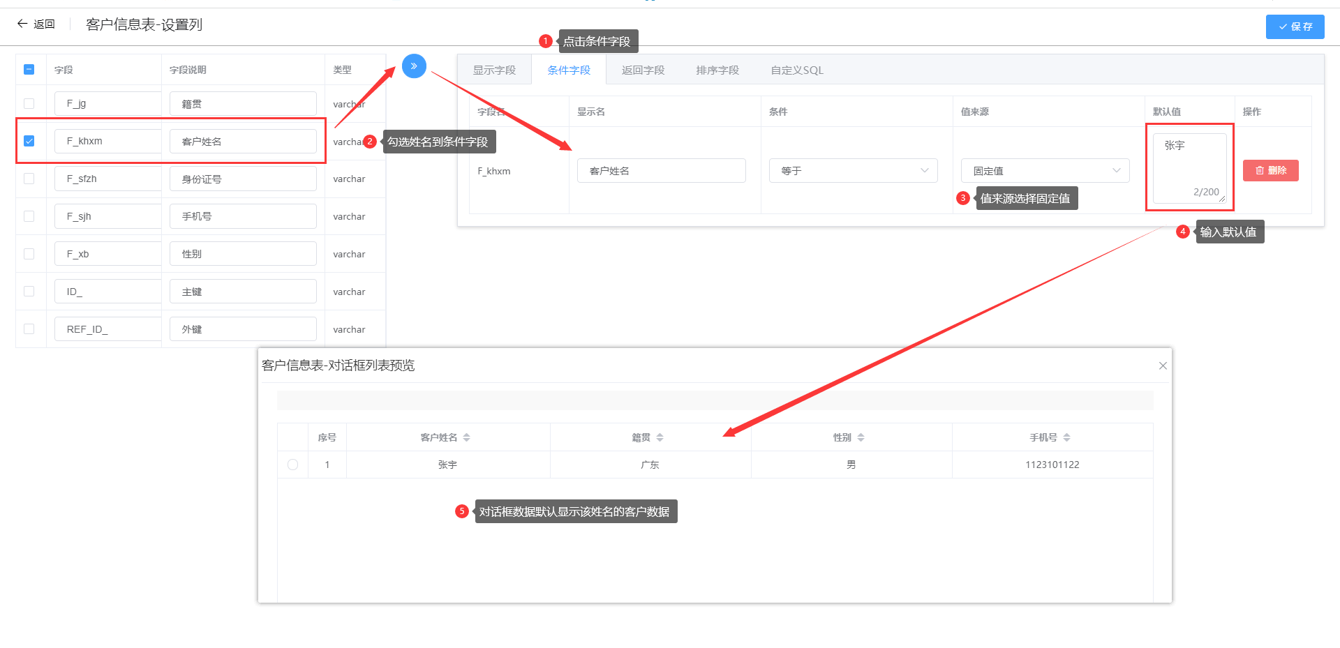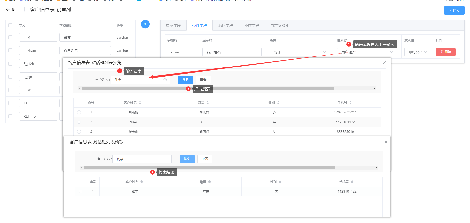 注:条件字段、返回字段、排序字段的设置方法与设置列表对话框的一样;