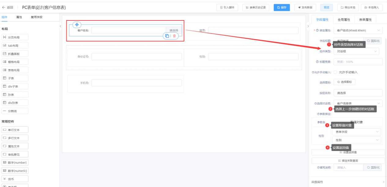 3.对话框绑定表单的步骤在【表单设计】中的控件说明有详细介绍;