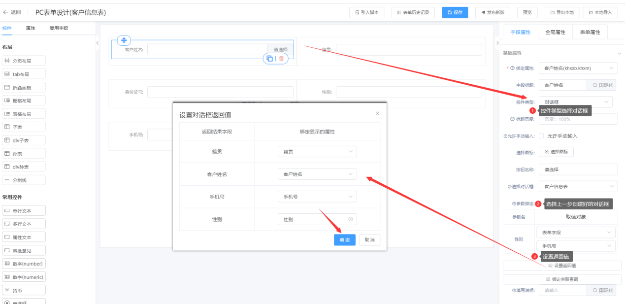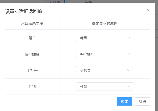 在表单中绑定对话框,选择要传入的参数。设置返回值,如下图: