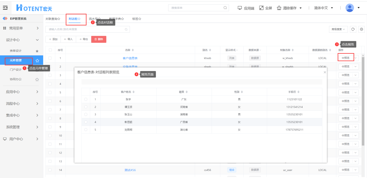 第一步:【设计中心】→【元件管理】→【对话框】,点击列表操作列的“预览”按钮,即可预览对话框;