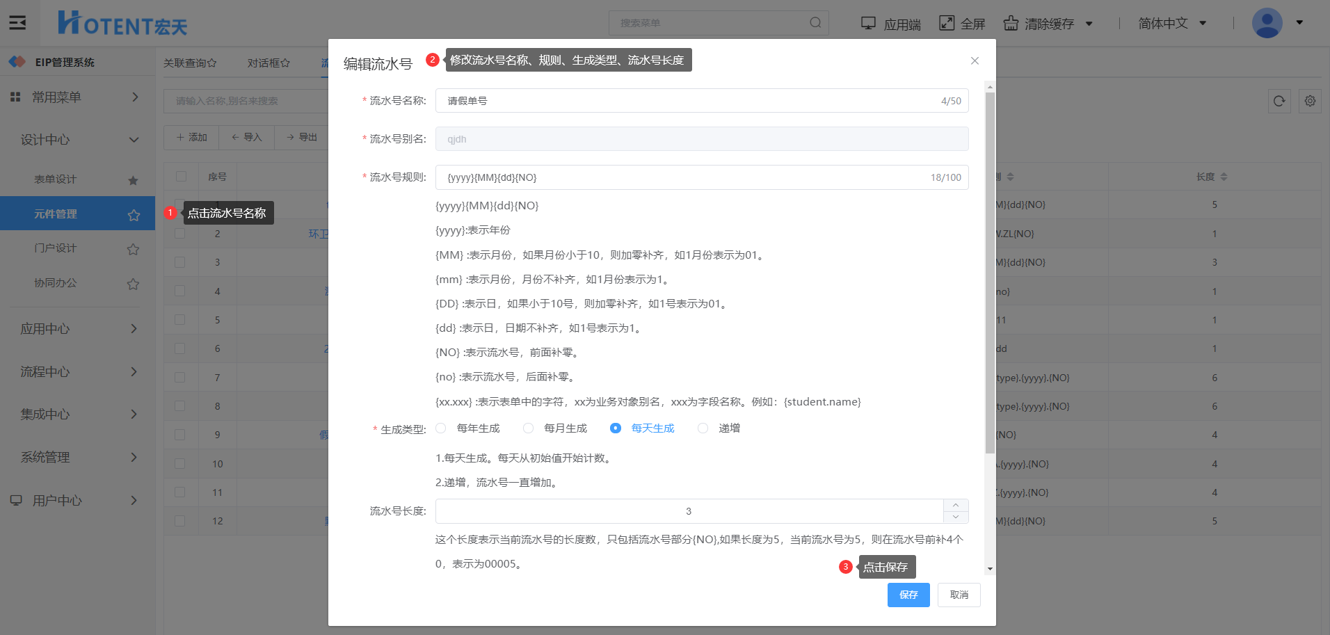 用于设置表单中使用到的流水号规则;如:报销申请单的单据号,合同管理的合同编号;
