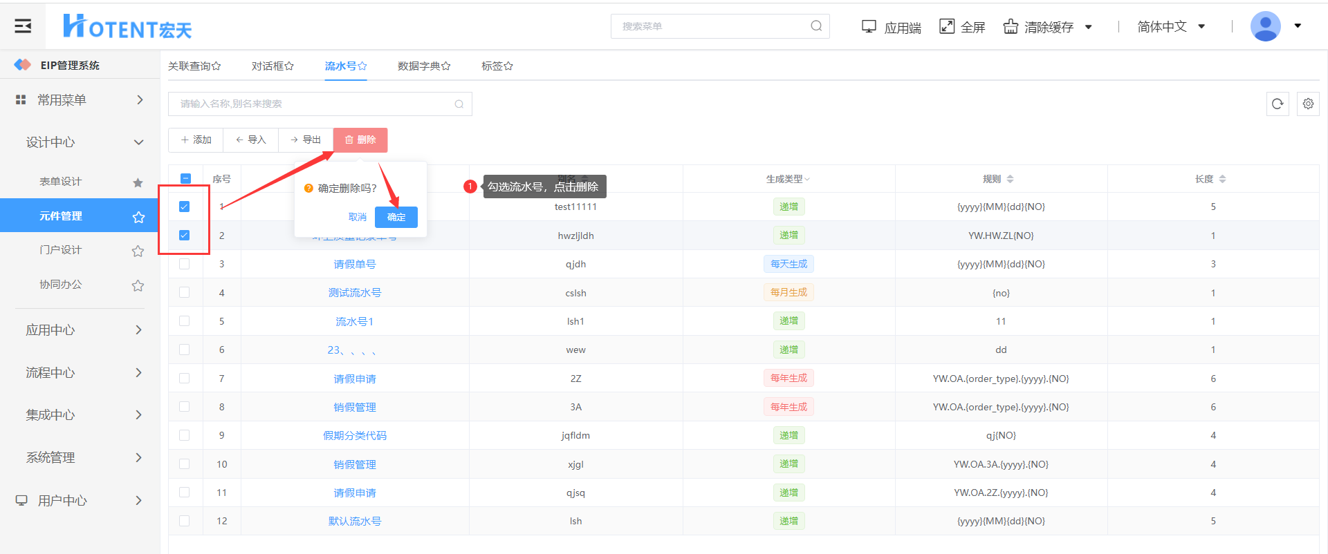注:删除流水号时请确认该对话框没有在表单中绑定使用,否则在表单中会中提示该流水号不存在;