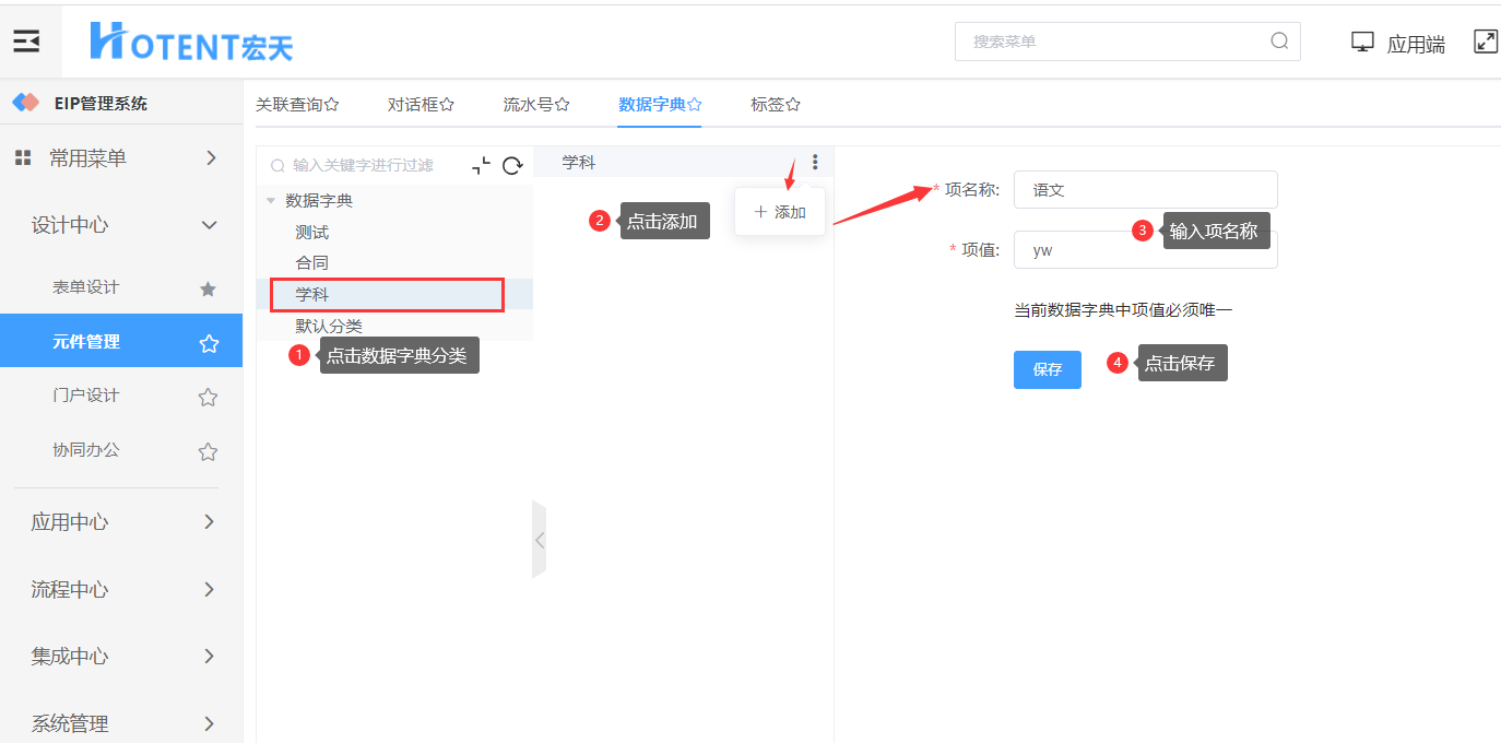 第一步:【设计中心】→【元件管理】→【数据字典】,点击“添加”;