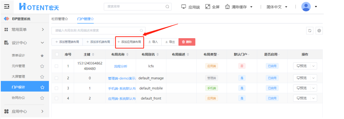 负责应用端、管理端和移动端的门户设计,【栏目管理】创建的栏目在对应的端布局存储。