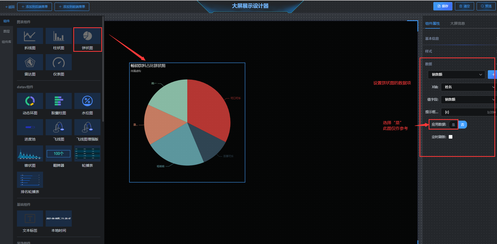 饼状图是以扇形区域大小表示每一个数值相对于总数值的占比,适用于显示一个数据系列中各项的大小与各项总和的比例,操作如图所示: