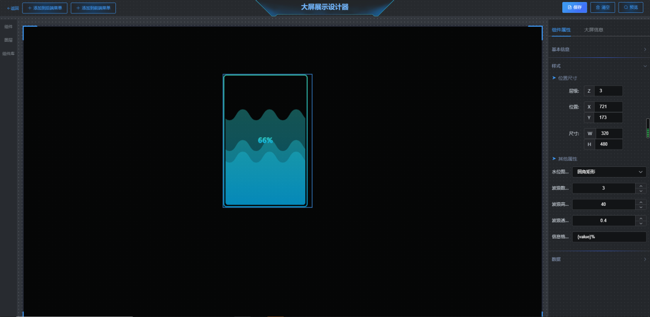 水位图支持自定义外框、文字及波浪的动画效果配置,能够使用波浪展示各水位的实时变化情况如图所示: