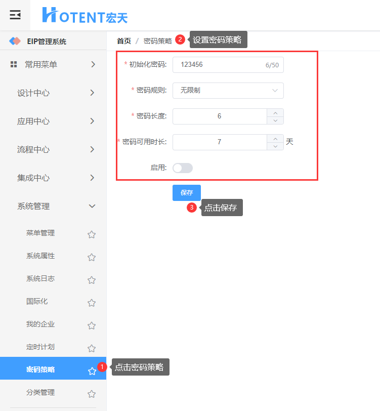 操作:【用户中心】→【密码策略】→在『密码策略』中修改“初始化密码”、“密码规则”、“密码长度”、“密码可用时长”→点击“保存”